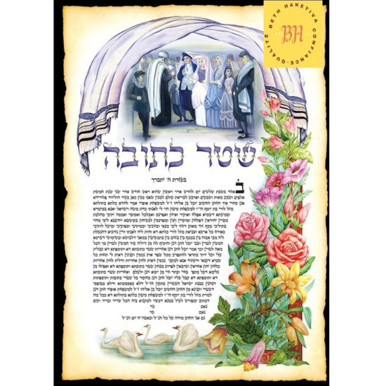 Parchemin pour contrat de mariage, Ketouba avec dessin d’une ‘houpa, cygnes et fleurs.